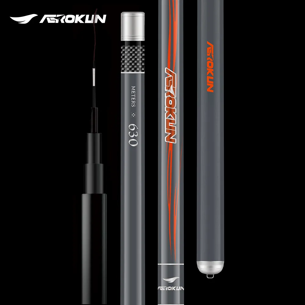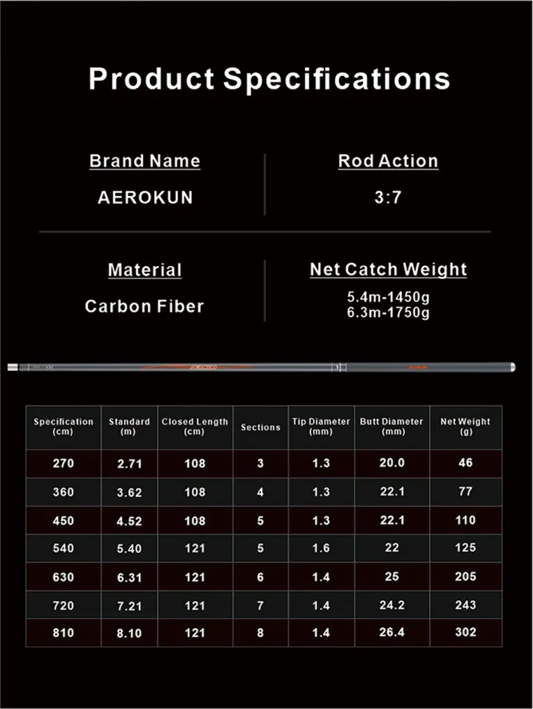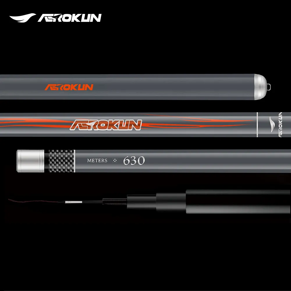 The AEROKUN carbon fiber fishing rod is crafted from high-strength carbon fiber, offering a perfect balance of lightness and durability. Designed for anglers who seek precision and control, it features a 3:7 action ratio, providing excellent flexibility and casting accuracy. This rod is suitable for both freshwater and saltwater fishing, meeting the needs of various fishing conditions. The rod comes in two net catch weight options: the 5.4m model weighs 1450g, while the 6.3m model weighs 1750g. Whether you're a beginner or an experienced angler, the AEROKUN fishing rod ensures a comfortable and efficient fishing experience.