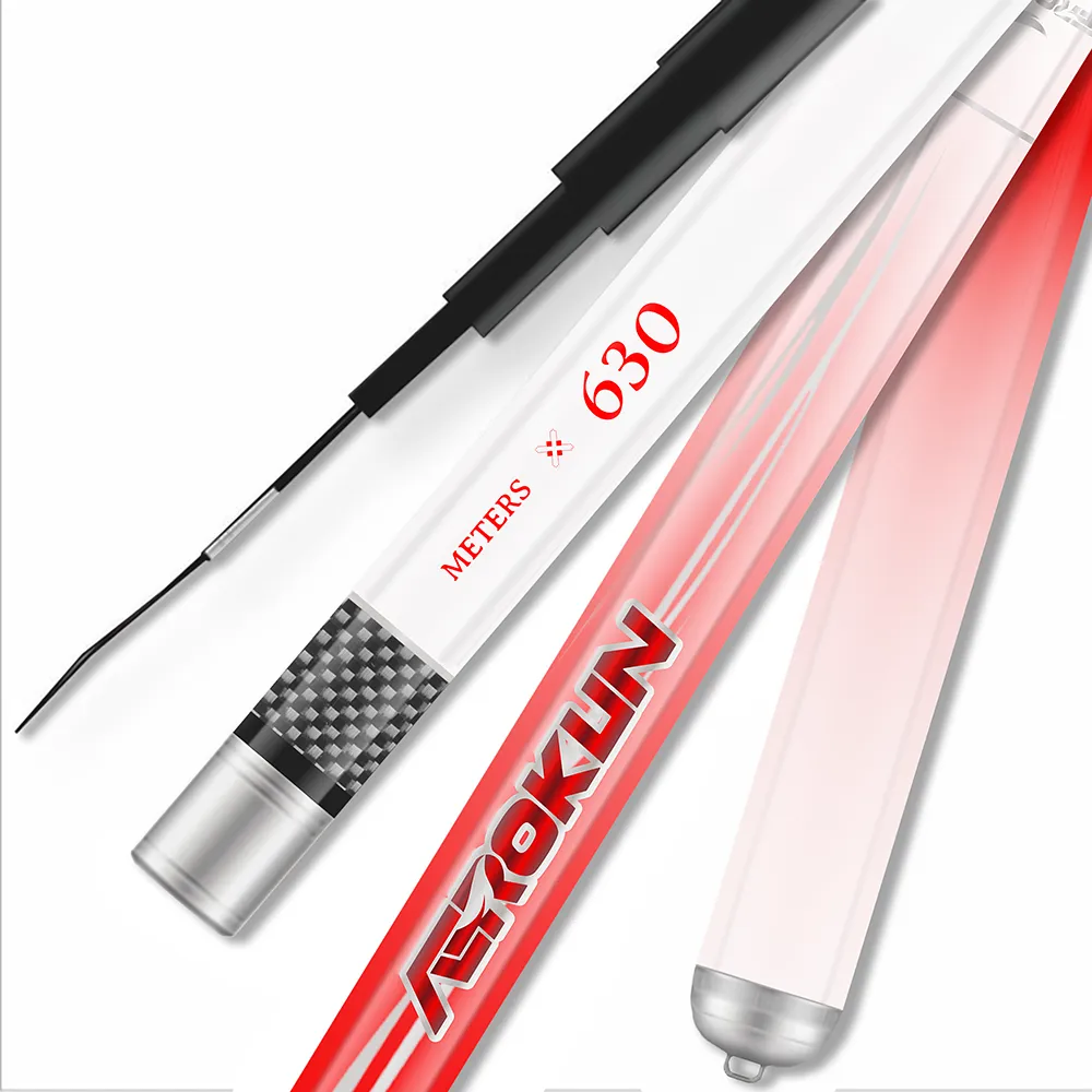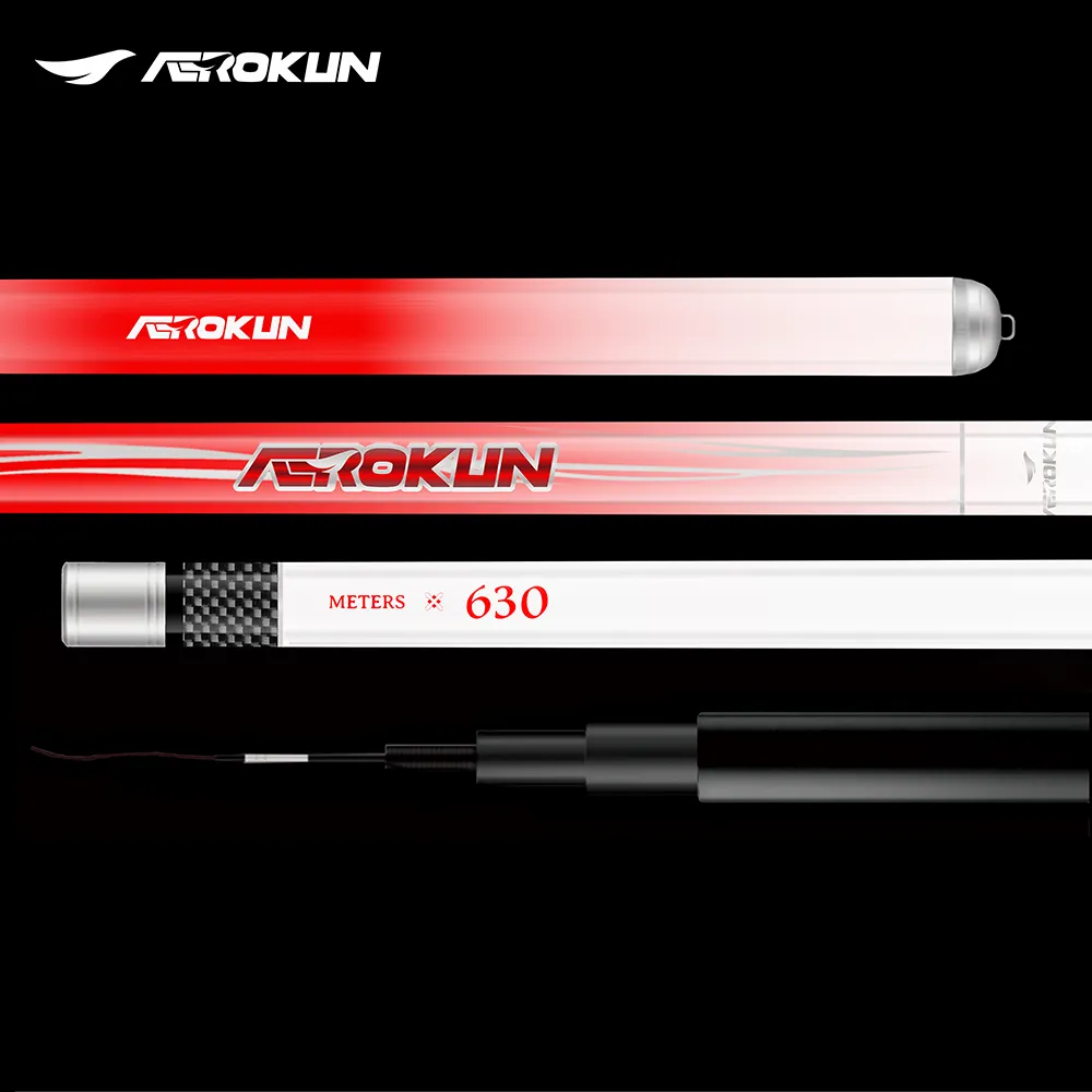 The AEROKUN fishing rod is made from high-quality carbon fiber for strength and durability. It features a 3:7 rod action, providing an ideal balance for various fishing techniques. The net catch weight specifications are as follows: the 5.4-meter rod supports a catch weight of up to 1450g, while the 6.3-meter rod can handle a catch weight of up to 1750g.